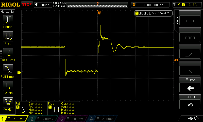 其次,当我在A的高侧MOSFET和B的低侧MOSFET上保持一个H桥接时(在不切换的情况下永久打开),然后在将负载增加到0.85 A或以上之后,OUT_A输出不是恒定的。 波形显示它正在尝试关闭A的高侧MOSFET。我正在附加波形。 第一个波形是放大版本的第三个波形。 第二个波形是高侧MOSFET的正常操作(发生在0.85 A负载电流以下)。