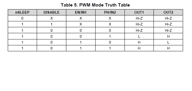 根据表5、PWM 的低电平状态将导致高阻抗状态。