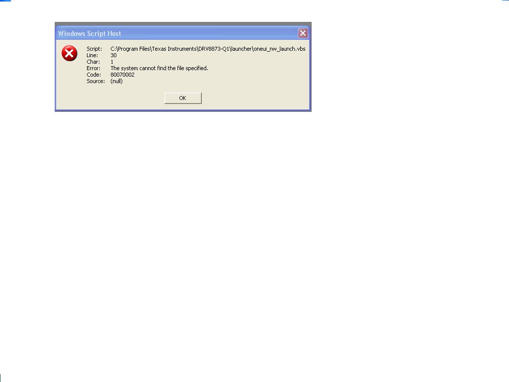 获取有助于评估 DRV8873-Q1 EVM 板的 GUI 文件并将其安装在 Windows XP 和 Windows 7上后,出现错误消息“Windows Script Host”,错误代码为:80070002。
