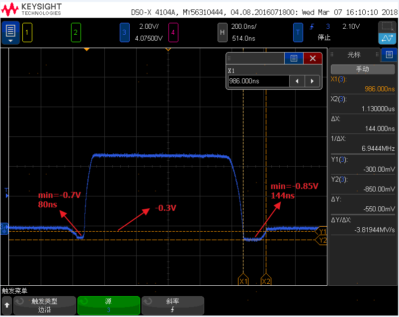 在实际情况下、我们观察到 OUTx 上的负电压(150ns 时为-0.85V)