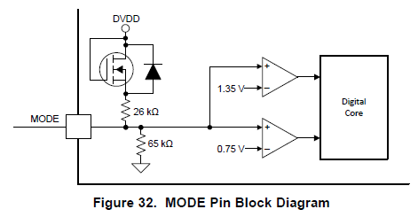 2) 2)数据表中显示了 MODE 引脚的内部连接、请参阅下文。 但是、将第一个比较器与1.35V 进行比较是否没有错误? 在分压器为26k 至65k 时、3.3V 的内部 DVDD 将提供2.35V 电压。 因此、高阻态或3.3V @模式之间不会有差异?