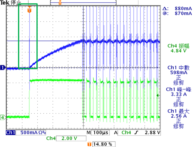 我的客户在电机启动时观察到大电流尖峰。 请参阅下面的波形。 (在 AOUT1测量)
