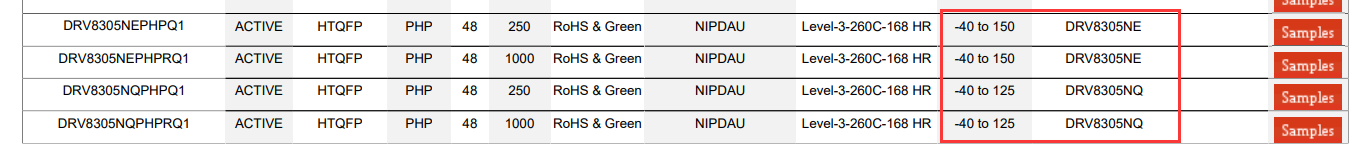 根据开发板的 BOM、表明8305的材料编号为 DRV8305NPHPQ1 (未指定 NQ 或 NE)。 但是、材料模型似乎未包含在该规格中。 该规范有两种类型的非 LDO 产品、即 DRV8305NQPHPQ1和 DRV8305NEPPHQ1、这两种产品与 BOM 不完全相同。