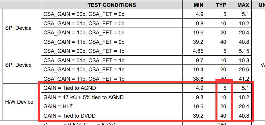 DRV8342H 在硬件中配置了增益悬空和电流增益比仅为10的情况。 通过将增益连接至0、电流增益仅为2.5、这是手册中所述总增益的两倍。