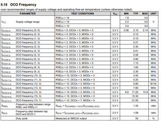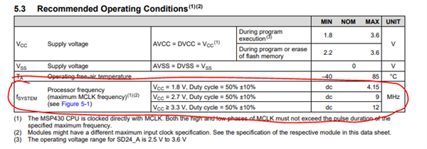 没问题。  根据 表5.18中的数据表、DCO 的最大时钟频率似乎取决于 VCC。  要以9 -12MHz 的时钟速度运行、您似乎需要 VCC >= 3.3V。  对于较低的速度、您可以看到2.7V 时的下一个限值(对于高达9MHz)以及任何低于2.7V 时的限值(对于低至1.8V)