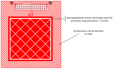 建议传感器电极和周围任何接地之间的间距为1mm。  对于此设计,金属表面必须接地,以防止金属在电气上浮动并导致与触摸板传感器耦合。