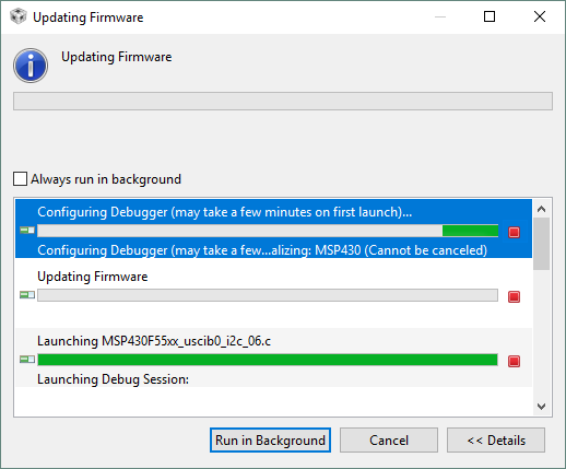 我不知道为什么,但是在我最近重新安装CCS (7.2 v.0.0.0013万)之后,当我将Launchpad连接到电脑时,我被要求更新它的固件。 它只是在更新过程中挂起,然后我最终必须取消。 有关其挂起的屏幕,请参阅随附的。