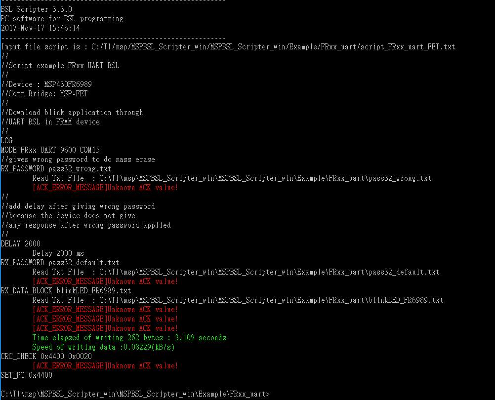 我运行了MSPBSL脚本程序并尝试使用MSP-FET来执行BSL。 我使用了FR6989 Launchpad和MSPBSL_Scripter_win\MSPBSL_Scripter_win\example。 我将scripter.exe放在同一个文件夹中。 我使用了文件夹中提供的脚本。 但是,BSL进程失败。 请参见下图。 我使用LA测量波形,发现MSP-FET未生成正确的BSL输入模式(测试/RST)。 当我使用另一个FET时,它可以生成正确的输入 模式,然后成功更新BSL流程。 能否告诉我在BSL通信模式中是否有任何MSP-FET设置要使用? 谢谢!