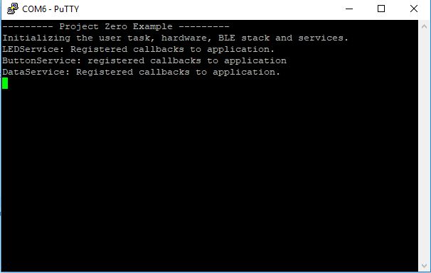 使用Putty查看串行监视器,如示例所示,我只获得有关MSP432的信息,而没有获得 有关CC2640R2的信息,我在智能手机上看不到蓝牙设备"零项目"。