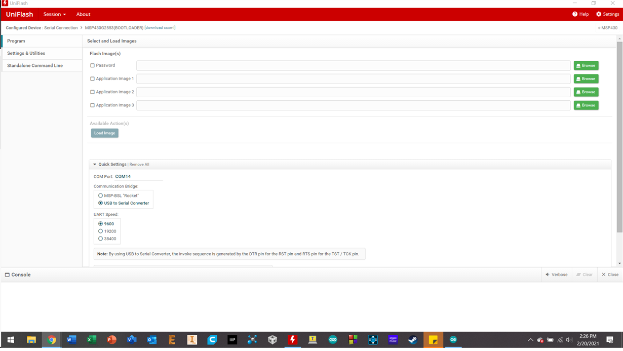 大家好、 我一直在尝试让 uniflash 程序将.hex 文件(内置在 CCS V10中)刷写到 MSP430G2553 微控制器上。 我 使用 MSP-EXP430G2ET Launchpad 成功刷写了 MSP430G2553芯片上的程序。 但是、当我尝试使用 FTDI FT232RL USB 串行转换器 (设置为3.3V 逻辑电平用于串行通信)时、 为了刷写 MSP430G2553 芯 片、我在控制台部分中得到了一个读数、表示"未接收到引导加载程序中 SYNC 命令的响应字节"以及屏幕顶部的错误横幅。 如果您对导致此错误的原因有任何建议、我们将不胜感激。