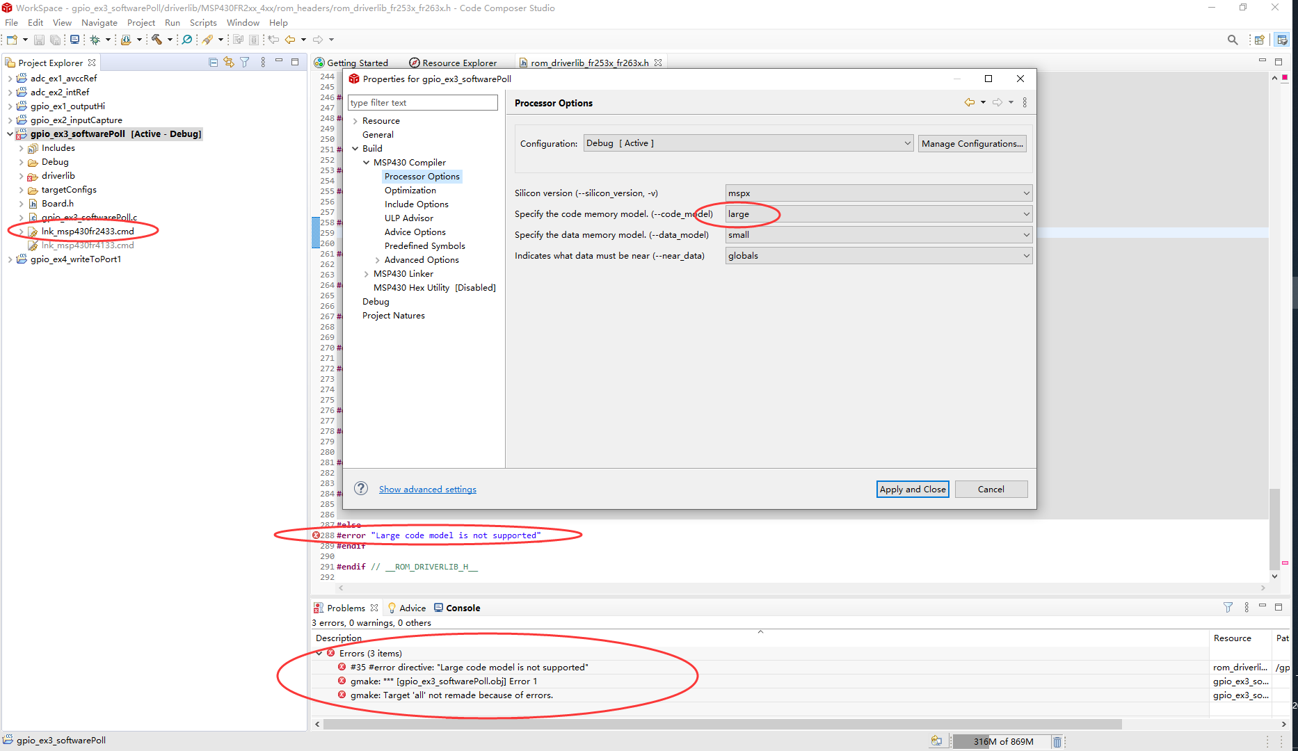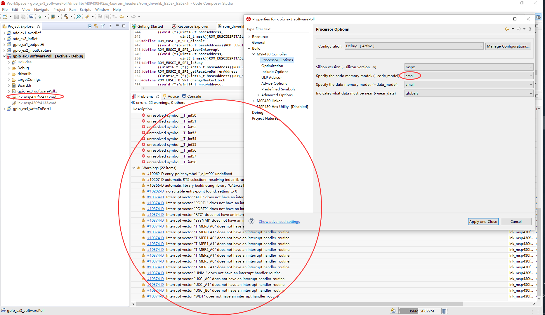 使用最新版本的 msp430ware 3.8、无论编译哪个工程、都存在代码模型大错误、但在我禁用相关错误后。 H 文件、编译正常