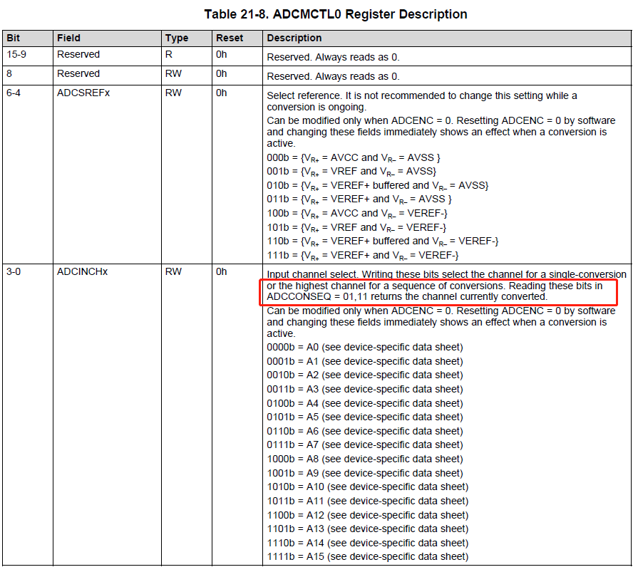 3.您可以通过在序列模式下读取 ADCMCTL0.ADCINCHx 位来告知通道#。 请参阅用户指南中的下图。