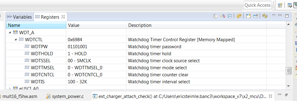 此外、我的看门狗计时器处于保持状态、我只是在程序开始时将其设置为保持状态。 然后、我进行一些配置并将其激活。 我不确定我在这里看到的是什么。 有什么建议吗? 我查看了该部分的存储器映射、只显示"reserved (保留)"。
