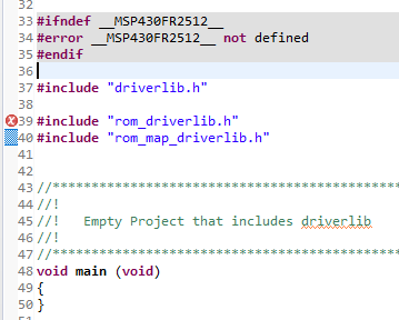 现在、我转到 main.c、为 ROM 头文件添加两个 include、第39行和第40行、以及几行以检查是否设置了_MSP430FR2512__、因此看起来如下所示:-