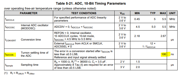 这里的动态变化有点不寻常(与"错误"不同、但可能会打开不同的窗口)。 SSEL0/PDIV0/DIV0的组合可为您提供32kHz/4/2=4kHz 的 ADC 时钟、该时钟相当慢。 与 SHT=15 (1k ADC 时钟)组合使用、输出速率约为4sps。 根据 CPU 的运行速度(MCLK)、在这个300k 时钟延迟期间、第一次转换可能会完成、也可能不会完成。 我提到这一点,因为这可能影响到第一次完成后的失败观察。