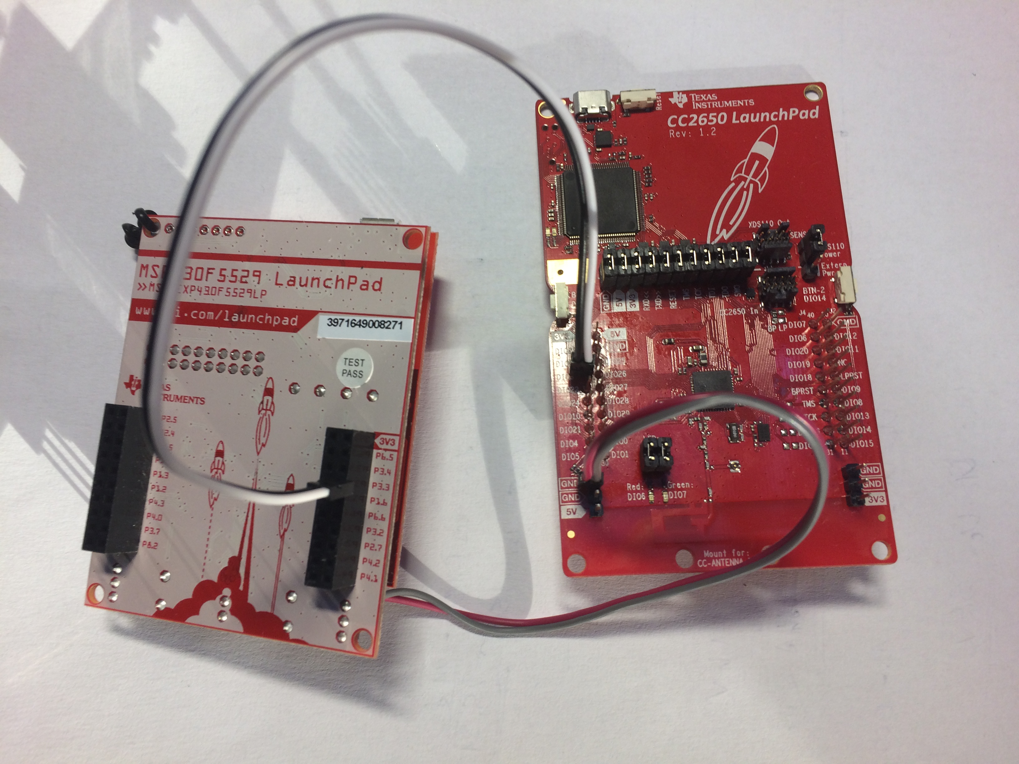 在这种情况下、我想指出的是、您的黑线连接到 MSP、而您的白线连接到您的 CC2650。 修复此问题是否可以使同一根导线连接两个 LaunchPad 来解决您的问题?