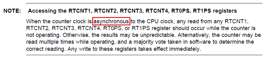 在这种情况下异步意味着 RTC 的时钟源与 MCLK 的时钟源不同。 这很可能不是导致客户遇到问题的原因。 他们是否已验证 RTC 的时钟源是否以预期的频率运行?