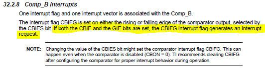 事实证明、他们是自助清算、我们花了一些时间才发现这一事实。  如果在线路之间读取、我假设可以读取突出显示的句子、表示"只要 GIE 被置位、并且 CBIE 和 CBIFG 或者 CBIIE 和 CBIIFG 都被置位、就会继续生成一个中断请求"、 但是、这当然没有在我身上跳出来、因为我熟悉比较器 A+的行为。