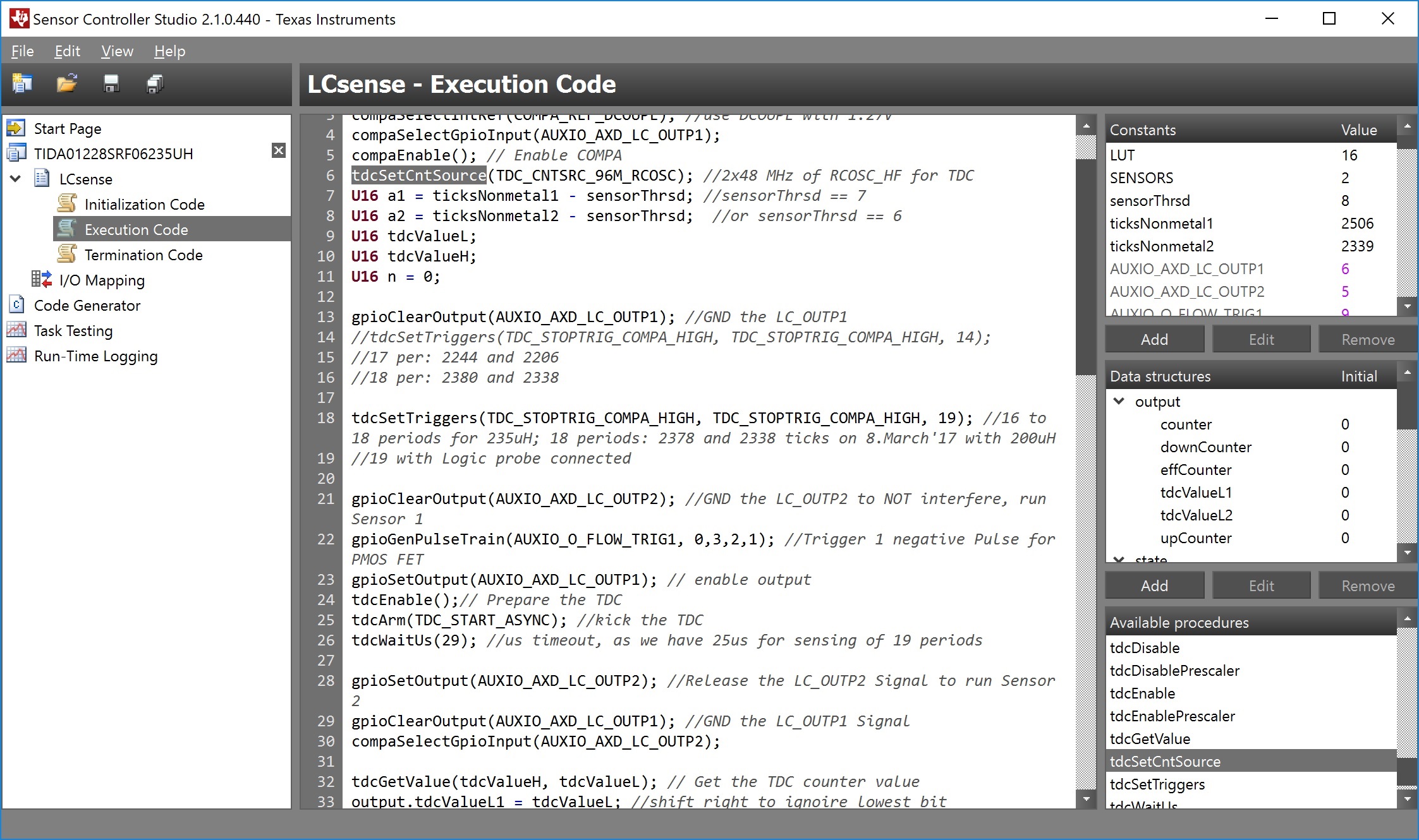 如果您使用 Sensor Controller Studio 中的帮助函数和电子函数的文档(请参阅右下角的"可用过程"窗口并双击)会更好、其中介绍了所有函数、触发器等-这将回答您的许多问题。