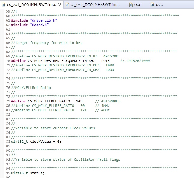 它们使用项目示例"cs_ex1_DCO 1MHz SWTrim "。