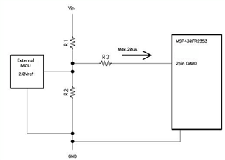 在电流配置中、可通过施加负电流进行电压校正。 例如、当 SAC0的 OA 输出设置为1.5V 时、如果下面电路中的外部微型计算机参考电压线路(根据输入电压的变化而变化)为2.0V、R3为100k Ω、5uA 将流入微型计算机内的 OA。