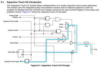 MSP430FR4xx_2xx 用户指南的第9节-电容式触摸 I/O 中有一节介绍了其工作原理以及启用该功能所需的寄存器/位。