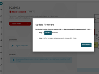 在使用 TI 软件(dev.ti.com/.../)评估 BQ25672RQMR 时、我们收到一条消息、内容如下:
