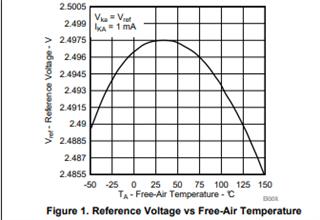 如"图1. 参考电压与自然通风温度间的关系"、数据表中提供了1mA 时的 Vref、但我找不到任何有关我将使用的条件的数据。