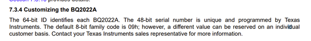 我目前正在从事一个项目、我们将使用 BQ2022a 芯片大规模生产电池组。 我们希望能够使用我们自己的唯一 ID 对 BQ2022A 进行编程、以便确定连接到哪个器件的电池组。