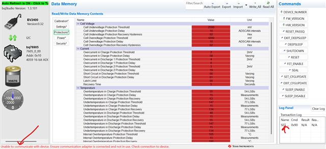 ‘UI 显示"无法与器件通信"、如第一个 bqStudio 图像所示、您能否仔细检查适配器与 EVM 和 PC 的连接、并关闭 bqStudio 左上角栏的‘Auto Refresh "来查看这是否有用? 您是否还在 bqStudio 打开时将任何其他 bq 器件连接到同一总线?