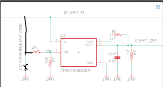大家好、我希望在这里获得一些帮助、我尝试使用瞬时触控按钮和 TPS22919来创建一个上电关闭开关。 从我读过的来看、这似乎是可能的、但我的设计无法正常工作。