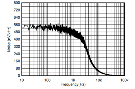 • 从上图中读取的噪声性能:480nV/Vsqrt (Hz)、即3.3 * 480nV/sqrt (Hz)= 1.6 uV/sqrt (Hz)