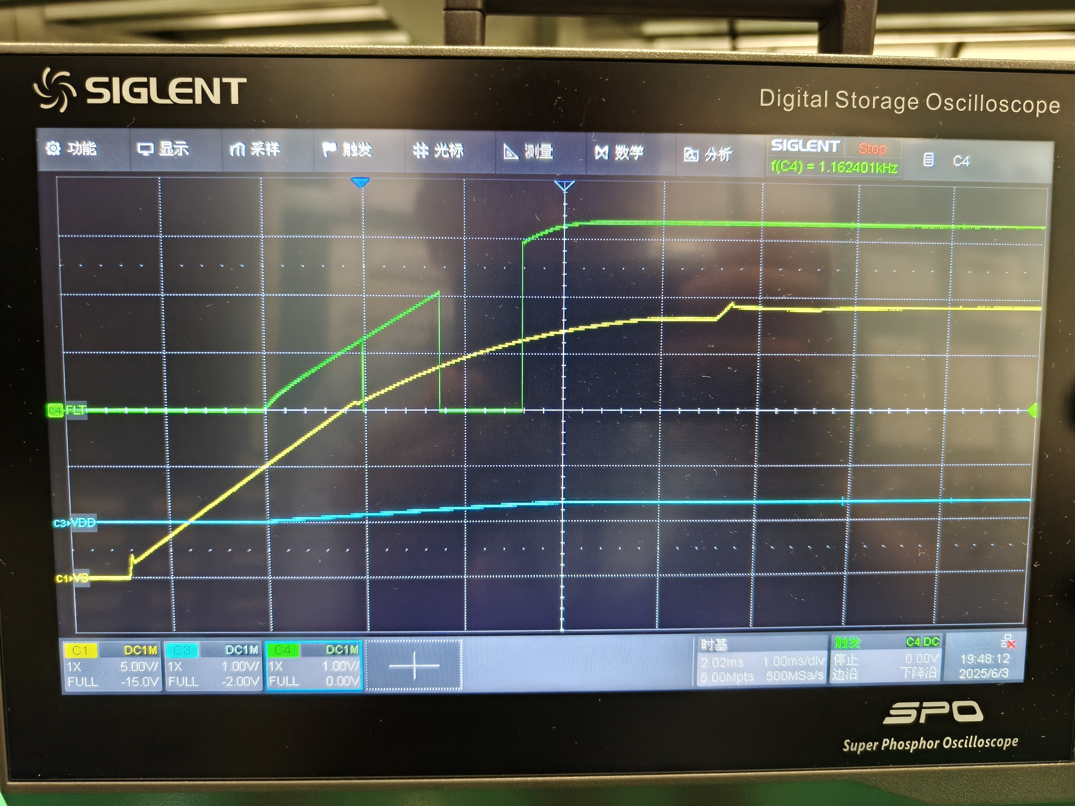 黄色是故障信号(绿色在光耦合器之后的 MCU 侧)。 红色信号是输出电压。 蓝色信号是