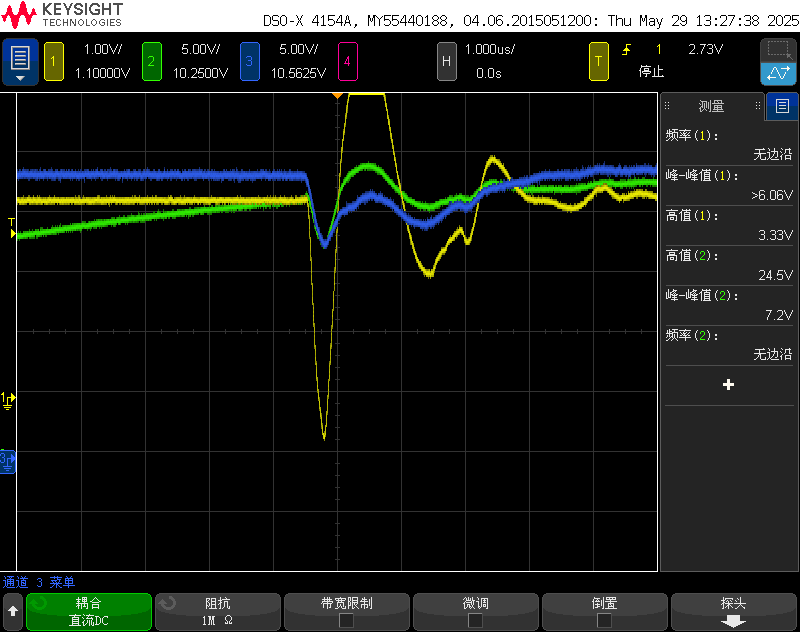 4.每次启用通道时是否会发生这种情况? 发生这种情况时、电源电压会下降。 此行为期间是否有电流波形? 如果绕过开关、在连接负载后是否仍会发生这种情况?