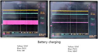 当问题发生时以及未出现问题时、您可以拍摄 STAT、PVCC、VBAT 和 SW 的示波器照片吗? 在闪烁图上、我希望至少看到3次闪烁。