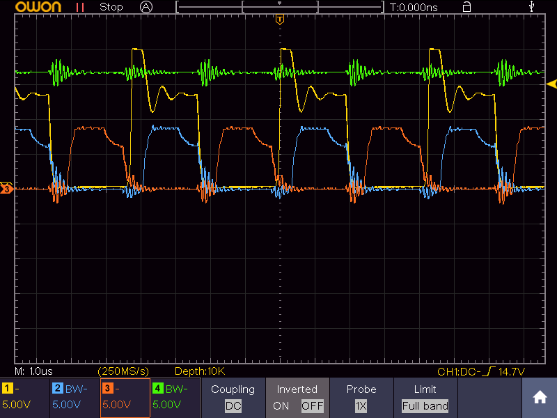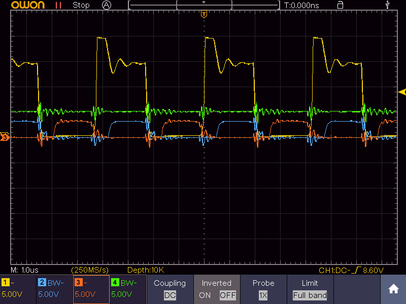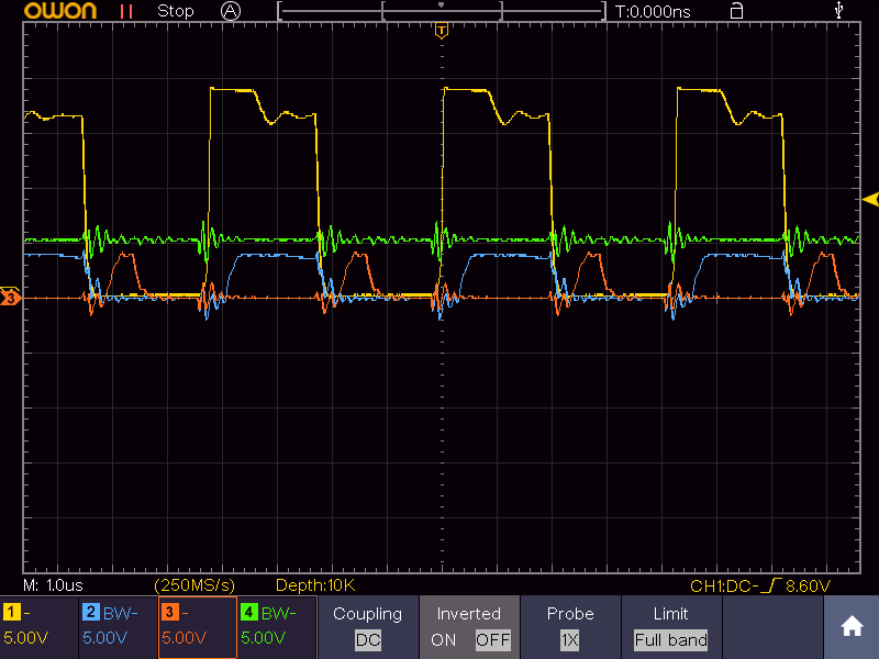 2. UCC24624 数据表显示、在 VDX 降至–265mV 导通阈值以下后、vgx 将在~155ns 时导通。  您的波形显示了绕组电压、但每个 VDX 输入都有一个与之串联的 1KR 电阻。  由于引脚和网络电容、该 1KR 电阻可能会增加 VDX 信号的延时时间。
