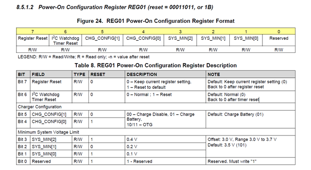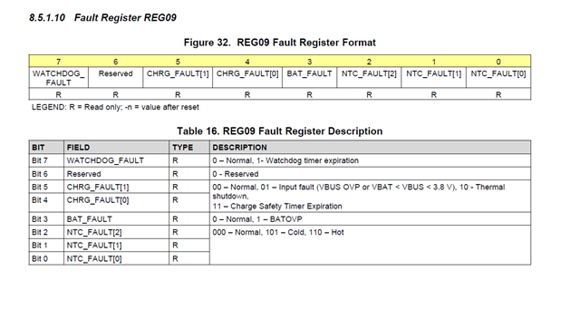 我们使用 BQ24195 和 TP25751 USB-NVM PD 控制器、我们可以看到根据 REG005 中的默认配置、看门狗计时器会在 40 秒后过期。 您能帮助我们了解触发看门狗的原因、计时器启动导致 40 秒后复位吗? REG001 的配置设置为默认值、因此不应在看门狗计时器到期后进行复位、而应正常工作。 我们还检查了 FAULT 寄存器和看门狗故障位是否清除、因此我们无法理解触发看门狗并在 40 秒后导致复位的原因。