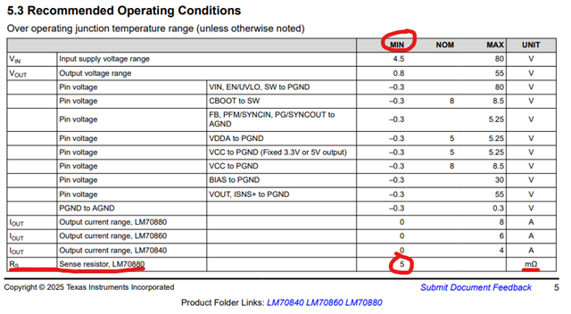在数据表中、建议 LM70880 的检测电阻应不低于 5m Ω。 请参阅下面的。