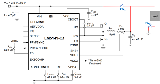请按如下所示检查原理图。 当 SW1 打开且 SW2 关闭时、负载电流从 Vin 通过 TEC 流向 Vout、这是流入 LM5149 的灌电流。