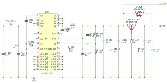 LM 用作 3V3 输出的降压稳压器。 由于冗余、这个电路增加了一倍、因此 LM 的两个输出都通过 MOSFET 连接、从而实现稳压器输出分离(如果其中一个 LM 关闭)。 当 LM 的输出端出现电压时、这些 MOSFET 会自动开路。