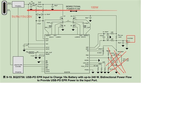 项目背景:客户的电池由其他充电器供电、并且可以插入和拔出电池。 不需要 Type-C 来为电池供电。 Type-C 的最大外部放电功率为 100W。 根据我目前对 BQ25756 和 TPS25751 规格以及 PMP41083 参考设计的了解、我有以下问题:
