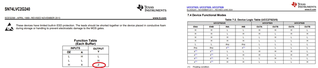 尝试使用 UCC27523 作为半双工、单线通信总线(2 个通道不会同时启用)、但它不工作。 看起来引脚 7 和引脚 4 短接至 GND、有什么帮助? 谢谢