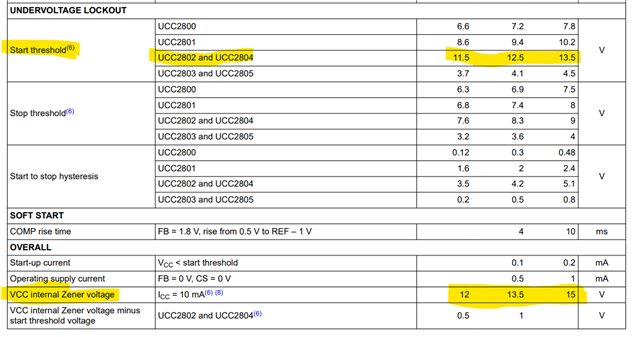 UVLO 的导通阈值范围为 11.5V 至 13.5V、而 VCC 最大电压为 12V。 在这种情况下: