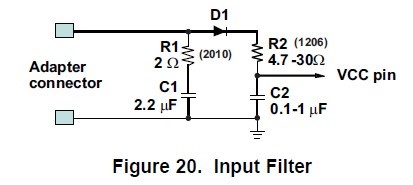 我们的工程使用 BQ24610、在 24V 适配器热插拔期间、VCC 引脚上会出现电压尖峰 (~36V)。 根据 BQ24610 数据表、第 10.2.2.5 节“输入滤波器设计“建议使用 RC 阻尼来抑制此类电压尖峰。