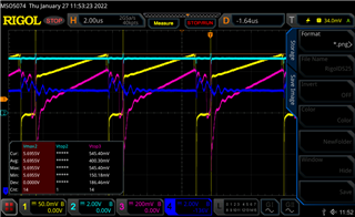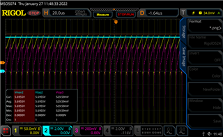 我们使用了 LM5022的增强设计。 当我们在温度室内进行测试时,我们注意到在温度范围低于零时,转换的增压开始限制输出(我们认为这是   输出电压降低)。 我们还在腔室内进行了一些信号测量,可以看到设备开始降低占空比,从而导致输出电压降低。 我们还检查了是否未达到感应电阻器上的峰值电流,这些电流由 RS2电阻器设置。