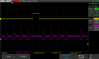 所附图像用于两种不同的 PWM 占空比。 CH1 (黄色)是 PWM,CH2 (粉红色)是开关。