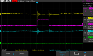 这是 LED 电压和 LED 电流的波形,两者都是交流耦合的。 请注意,对于电流测量,我使用了电流钳(HANTEK CC-65),因此该值可能不是非常精确(尽管我在测量前将其归零)。
