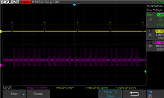 我已附加了两个示波器,均为31.37kHz PWM 频率@ 3.14%占空比。