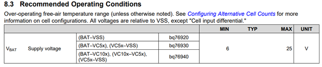 这是每个电池组之间的最大电压,因此建议的最大总烟道电压实际上为50 V 在 BAT 和 VC5x 之间,应为25 V,在 VC5x 和 VSS 之间,应为25 V