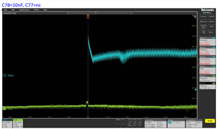 我们测试接通响应”,最小负载放大,输出电压(Ch2)明显过冲,电压为环。